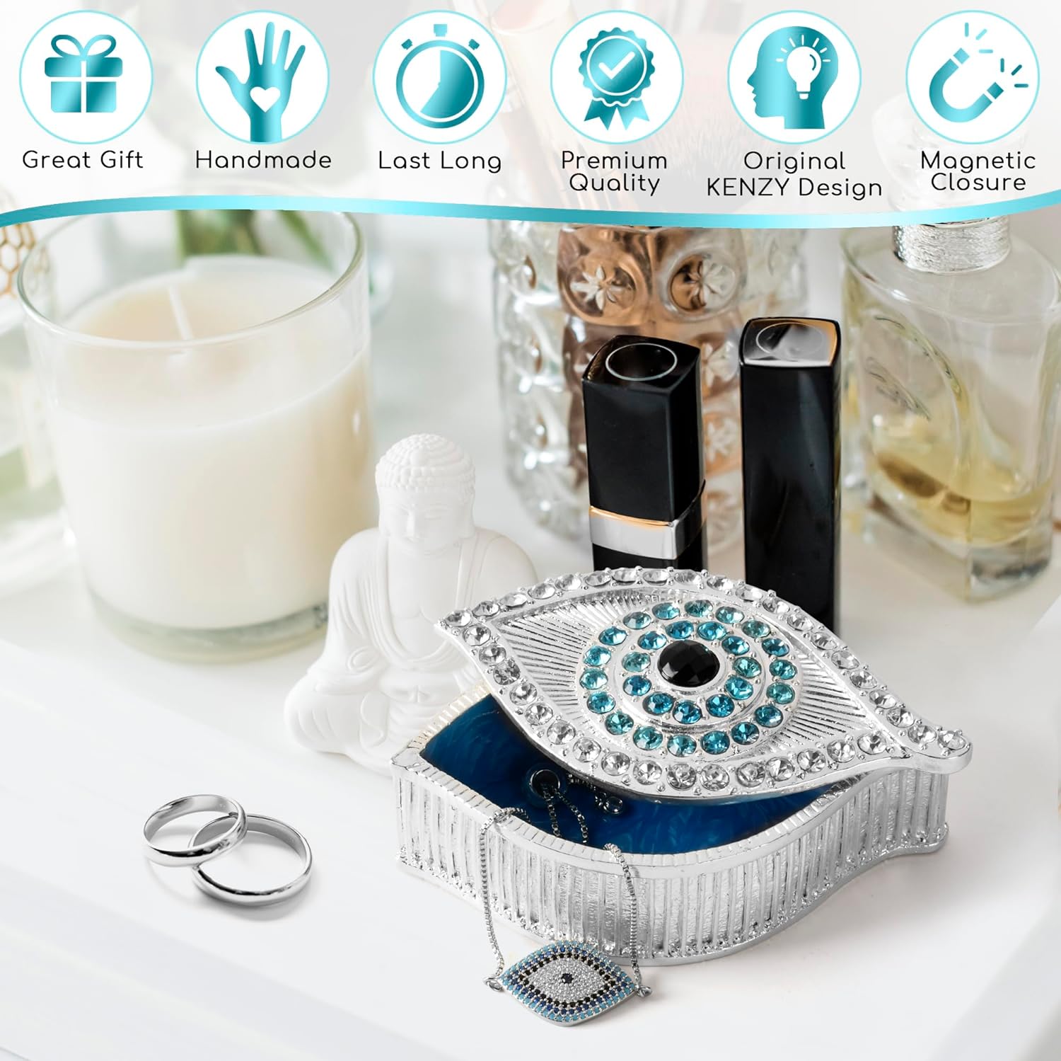 - A Handcrafted Jewelry Case - Feel like royalty when you use this keepsake box. The gold, hinged lid of this evil eye home decor box has a decorative inlay with Swarovski crystals - a gorgeous accent piece
